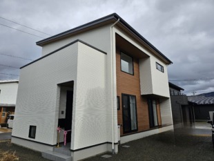 外観はアーバンデザインのホワイトの外壁を基調に、木目のアクセント外壁を入れてスッキリとかっこよくまとめさせていただきました。