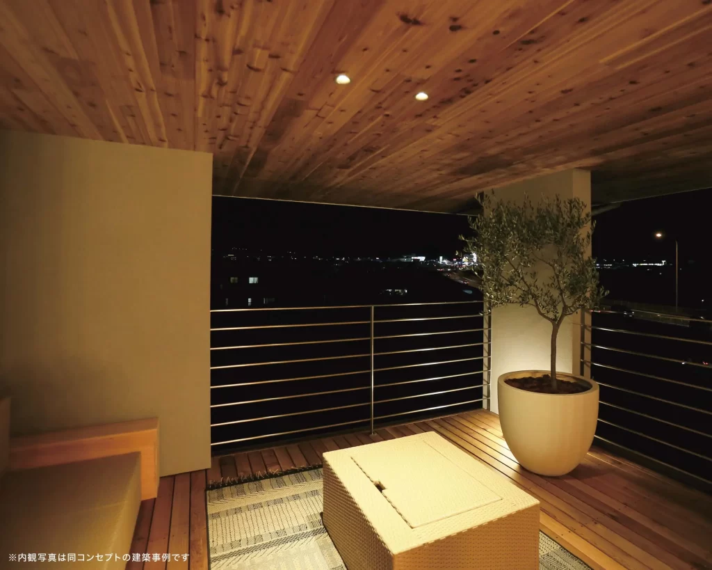 北側の窓からは、やわらかな朝日を感じながら、眺望をたのしむ。冬は吹き抜けから差し込む陽光が室内を温かく包み、夏は深い軒が日差しを遮って快適に。星空の下でくつろぐベランピングも楽しめる、四季の移ろいを感じる心豊かな住まい。