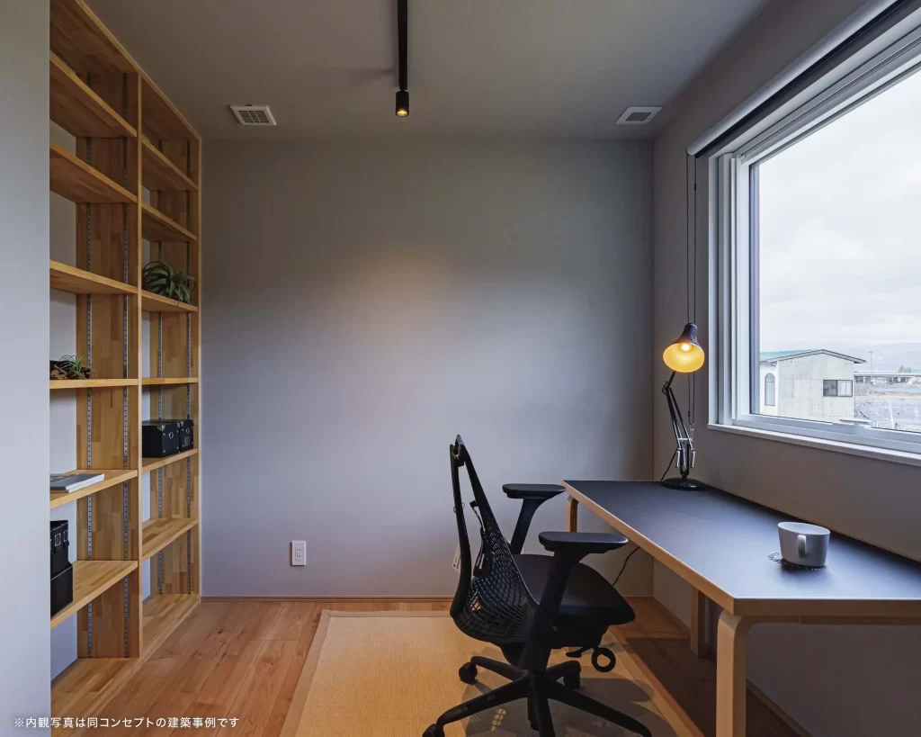 在宅ワークを快適にする3帖の書斎は外からの視線を遮り光と風を取り込みます。吹き抜けの自然光が心地よい無垢床のLDKは、庭へ延びるデッキで開放感をプラス。緻密な採光/照明計画でお仕事のON/OFFを自在に切り替えます。