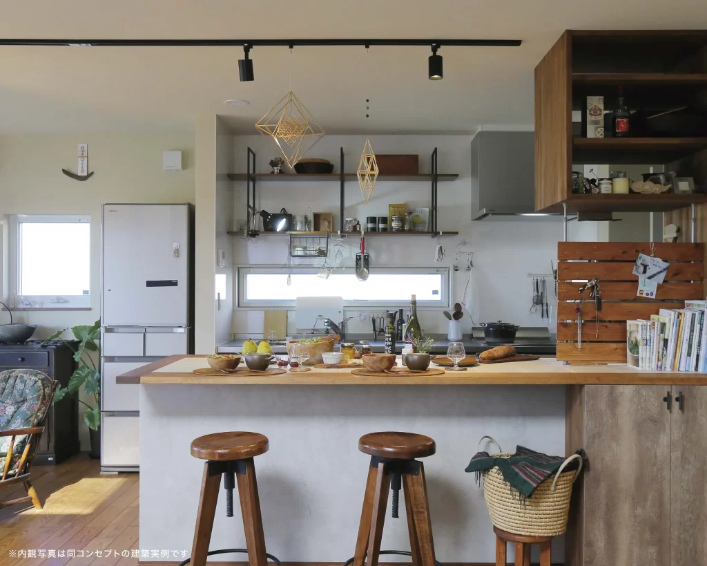 趣味を楽しむご夫婦のための、収納たっぷりな住まい。カップボードと一体で造作した大きなキッチンカウンターは、料理にも趣味にも使える便利な作業台に。使い勝手のよい土間と3.5帖の広めの書斎が、暮らしと趣味の幅を広げます。
